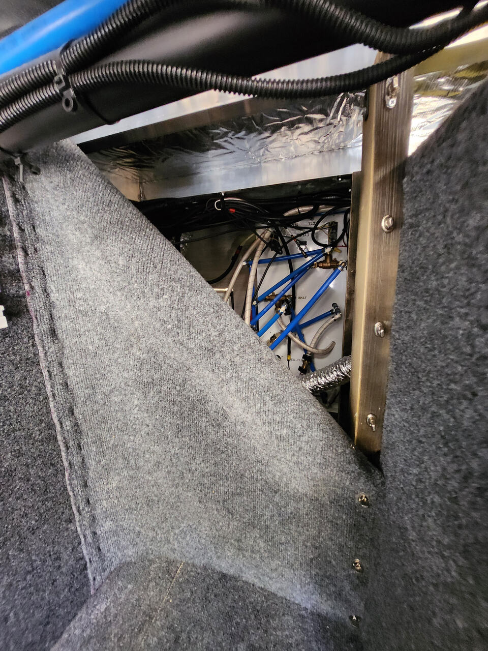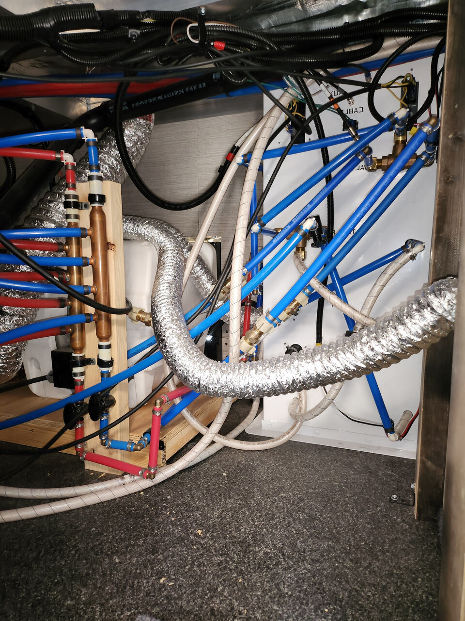 Thanks for the info and the photos. I notice that you didn’t replace the manifolds, that is one of the reasons for me wanting to redo the whole mess in mine. The first week I had mine the hot water inlet to manifold blew out. I got it back in there but every time one of my leak detectors starts chirping I wonder if it has done it again?? I am so tired of patching a temporary fix. My shower drain plastic nut was cracked and VanLeigh stuffed a tube of silicone around it. That was the very first leak I had and I have not trusted anything else in this piece of junk since! It took two days for me and a mobile repair man to dig it all out and he was able to fix while I was working a seasonal job. We had the 5” hole for the heat duct to work with.