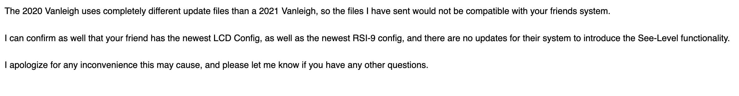 Ya sorry its unfortunate. My next step was to reach out to somebody I know with a 2020 VL and get their Seelevel update files until that idea kinda died with their statement regarding your version numbers. I am guessing they were updated with the Firefly update? Be interesting to see - if you know the before and after versions.